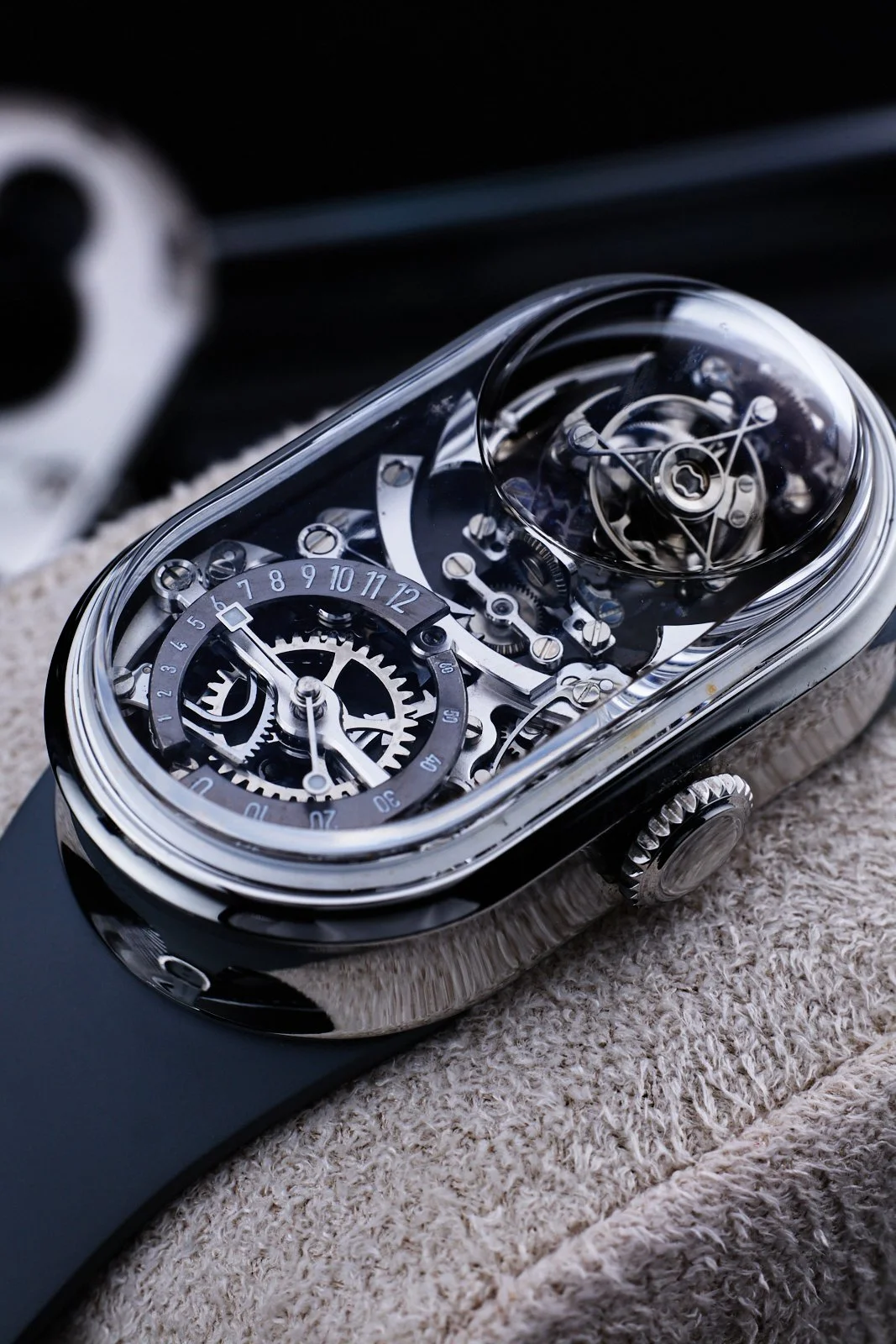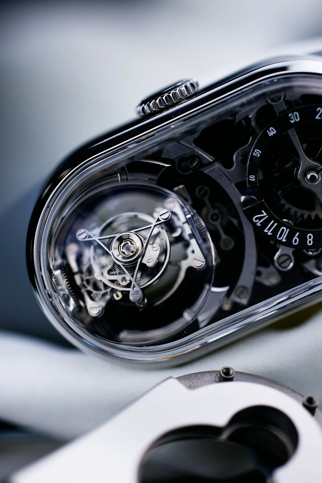 The Mark 1 Möbius makes its boldest statement by defying expectations. At its heart beats the in-house calibre M01T, a hand-wound movement that orchestrates one of watchmaking's most compelling mechanical ballets: a bi-axis tourbillon paired with retrograde jumping hours and minutes.