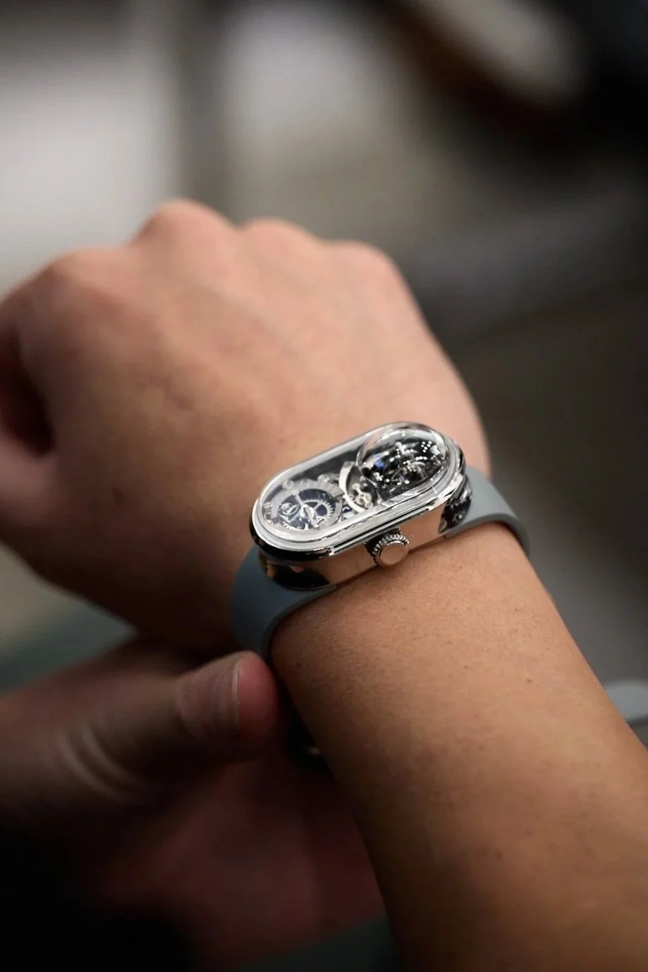 The tourbillon cage itself evokes the Möbius strip that gives the watch its name, a subtle twist symbolizing infinity and the continuous flow of time. Later upgraded to an exclusive titanium alloy case, it rotates on two axes: the first every 60 seconds, the second every 90 seconds—a refinement made after early prototypes revealed that a slower 150-second rotation lacked the desired kinetic drama. The result is a mesmerizing display that transforms timekeeping into pure mechanical theater.