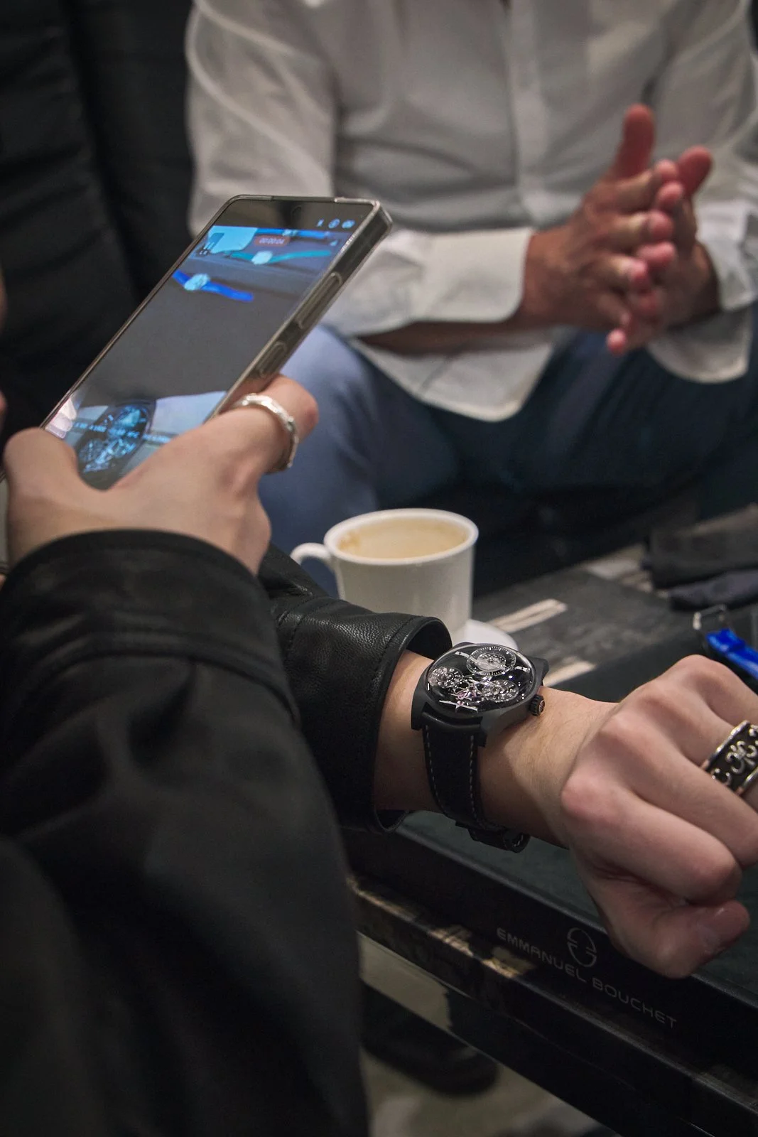 From the Complication One, Bouchet developed two distinct personalities. The Aleph leans minimalist—think floating sapphire discs, muted textures, and a meditative quality that lets the mechanics breathe. The Contrast goes graphic and modern: sandblasted titanium, black ADLC coating, blued steel components, and ceramic elements that create sharp visual tension.
