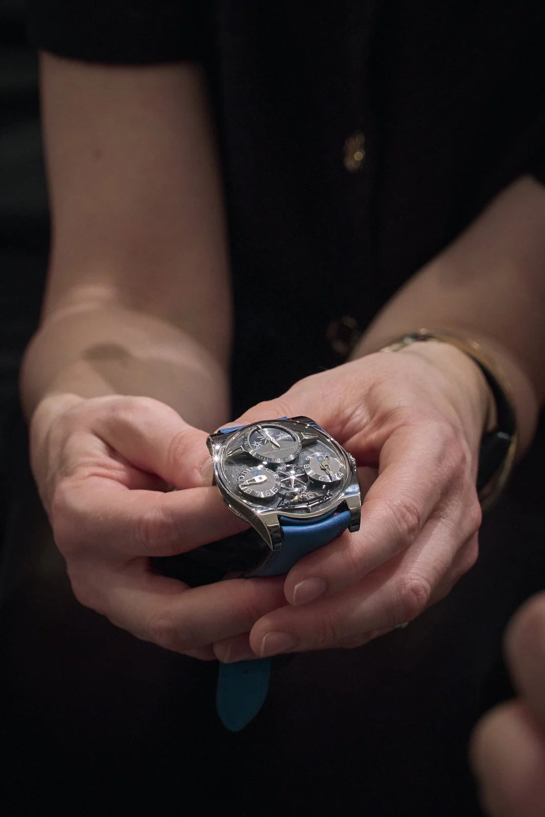 This isn't decoration—it's functional. Bouchet slowed his movement to 18,000 vibrations per hour specifically so wearers could see the mechanics at work. The time-telling hands float on transparent sapphire discs above black onyx or lapis lazuli bases, creating depth without clutter. It's a regulator-style display taken to its logical extreme: time broken into components, presented as three-dimensional architecture. The Complication One respects intelligence. Nothing is hidden; and everything is explained by looking closer.