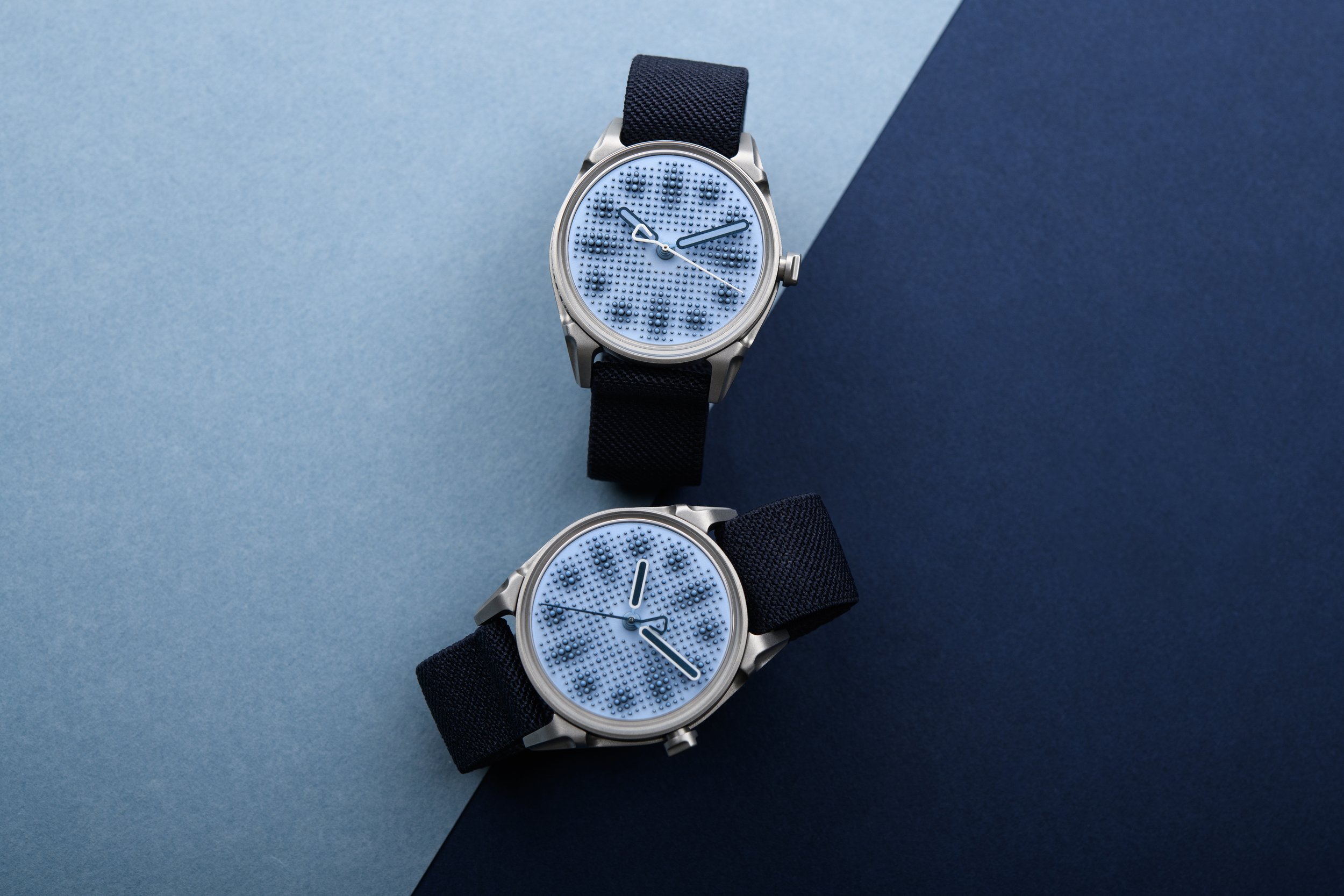 Regardless of the version, Projket 01 Variant "G" is all subtle intrigue that amplifies as you get closer to the watch. The dial, in a matte powdery cornflower blue hue, is infused with blue emission Super-LumiNova. It is set by hand with 468 steel pins in six varying widths and heights, with the hollowed tips hand-filled with the same luminescent blue pigments as the dial, as if raised from the flat surface by the pins.