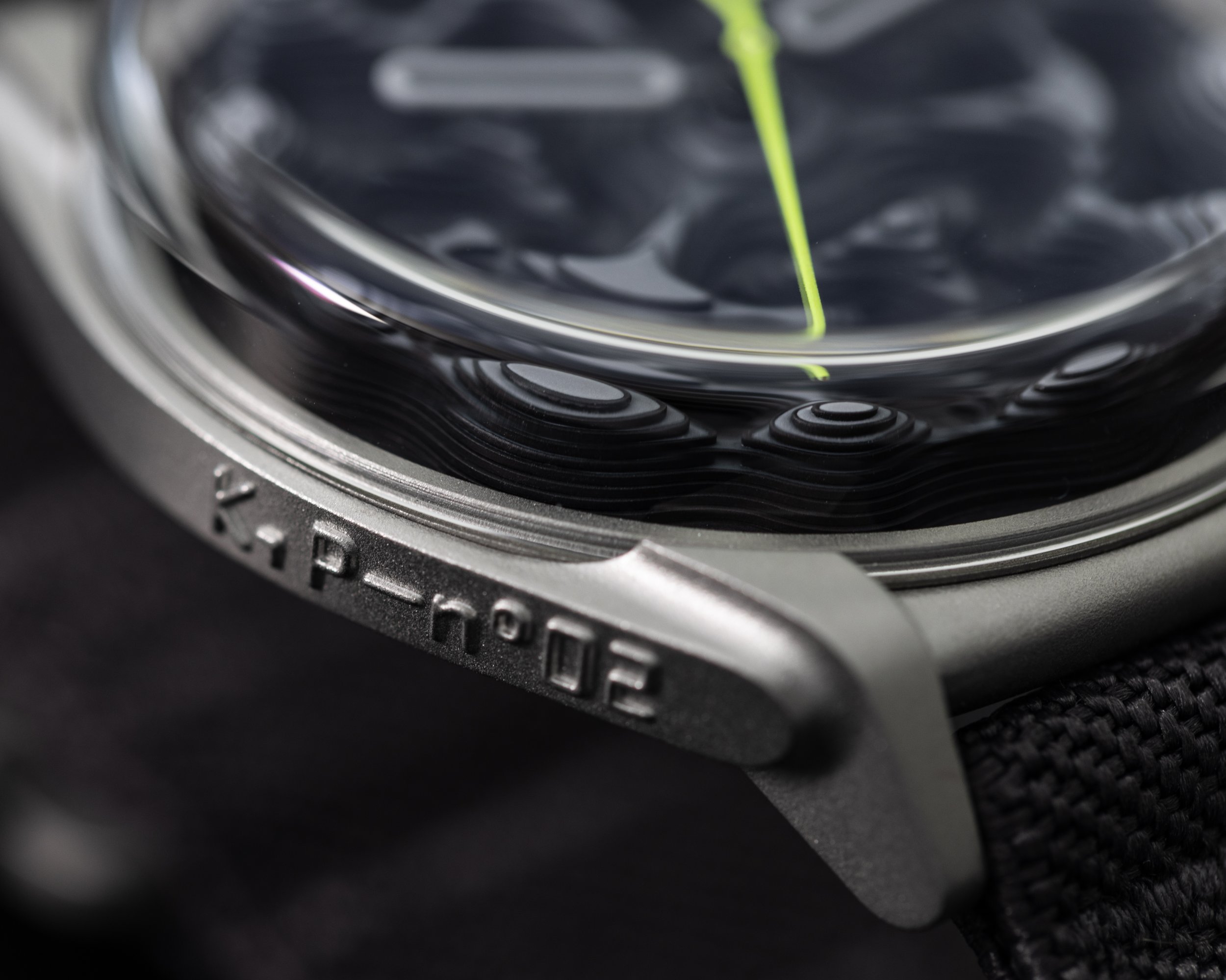 The case architecture defies convention: no bezel, no caseback, no detachable lugs. Instead, a barrel-shaped central element appears held in place by four triangular lugs, creating an integrated, indivisible unit. The rounded bottom and downward-sloping lugs ensure surprising wrist presence—substantial yet wearable. Branding is minimal: only the project's internal designation K,P–n°02 appears in relief on the case flank, alongside the signature triangular valve-shaped crown.