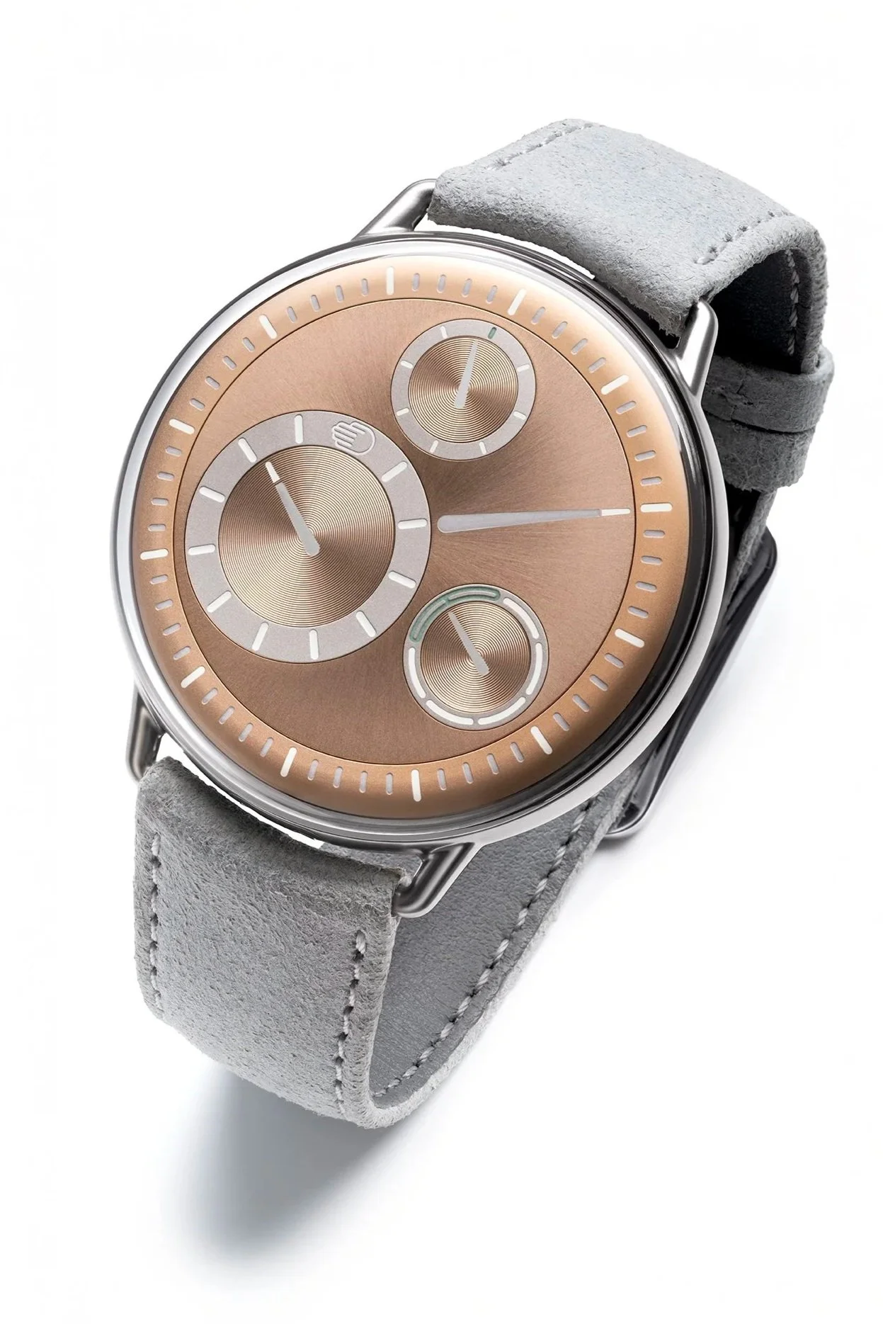 The light grey suede strap might seem like an afterthought, but Mintiens intended it as a specific counterbalance. “We wanted something that would complement the rose gold without competing with it,” he notes. The suede’s matte texture absorbs light, allowing the dial’s warmth to command attention while keeping the overall aesthetic modern and versatile.