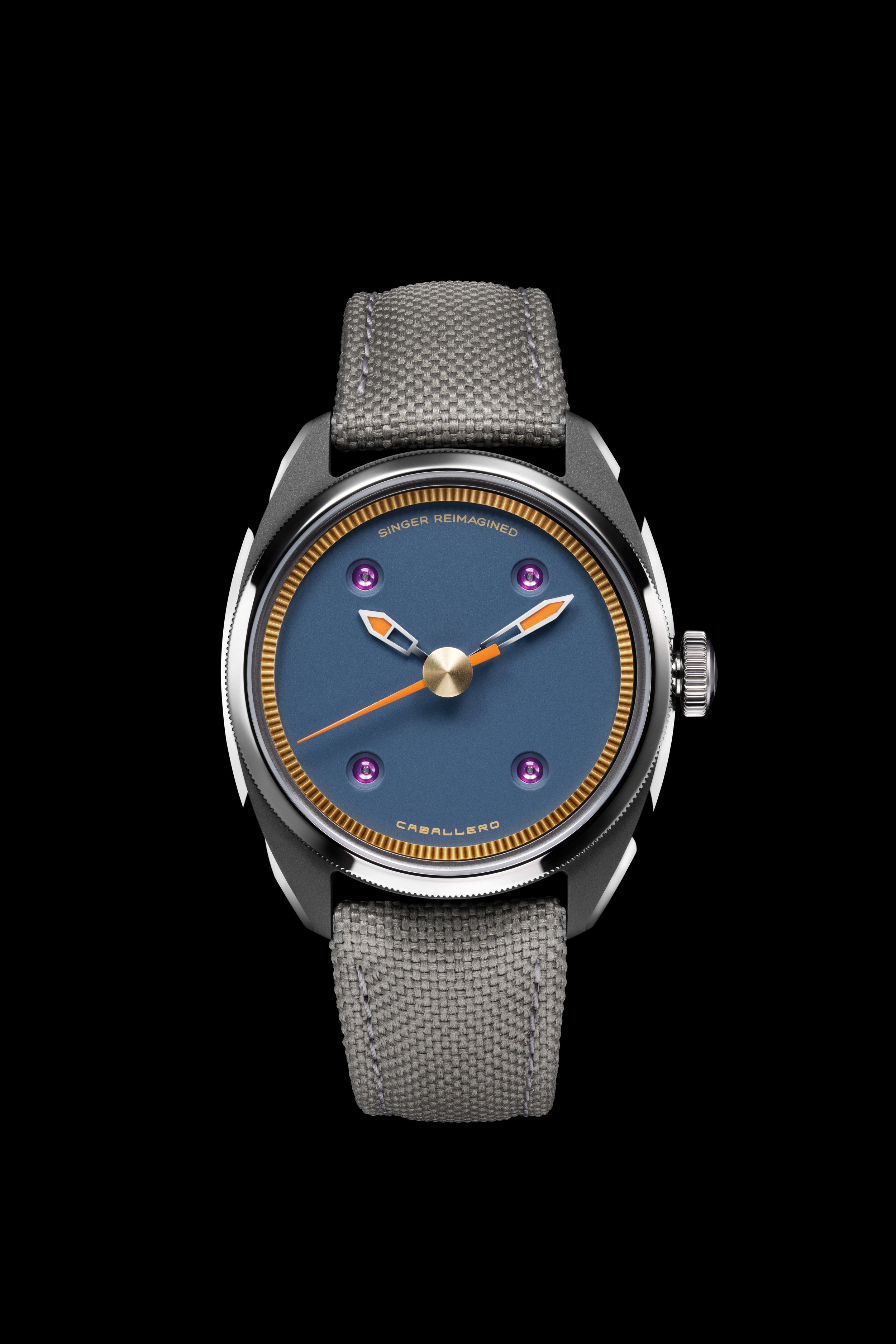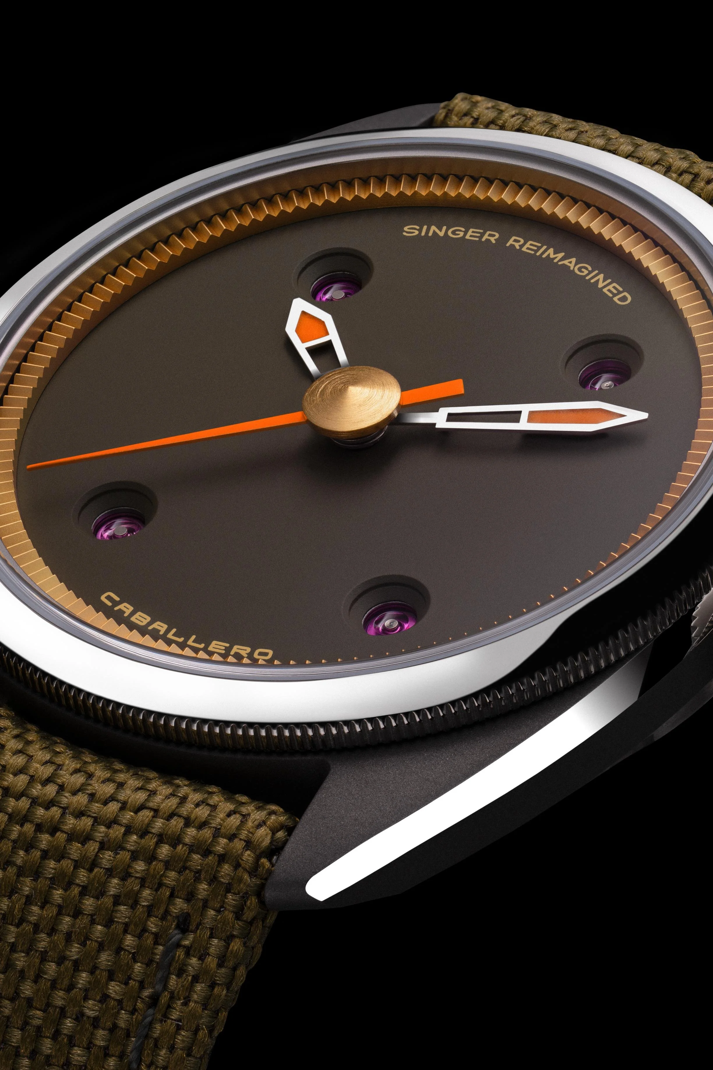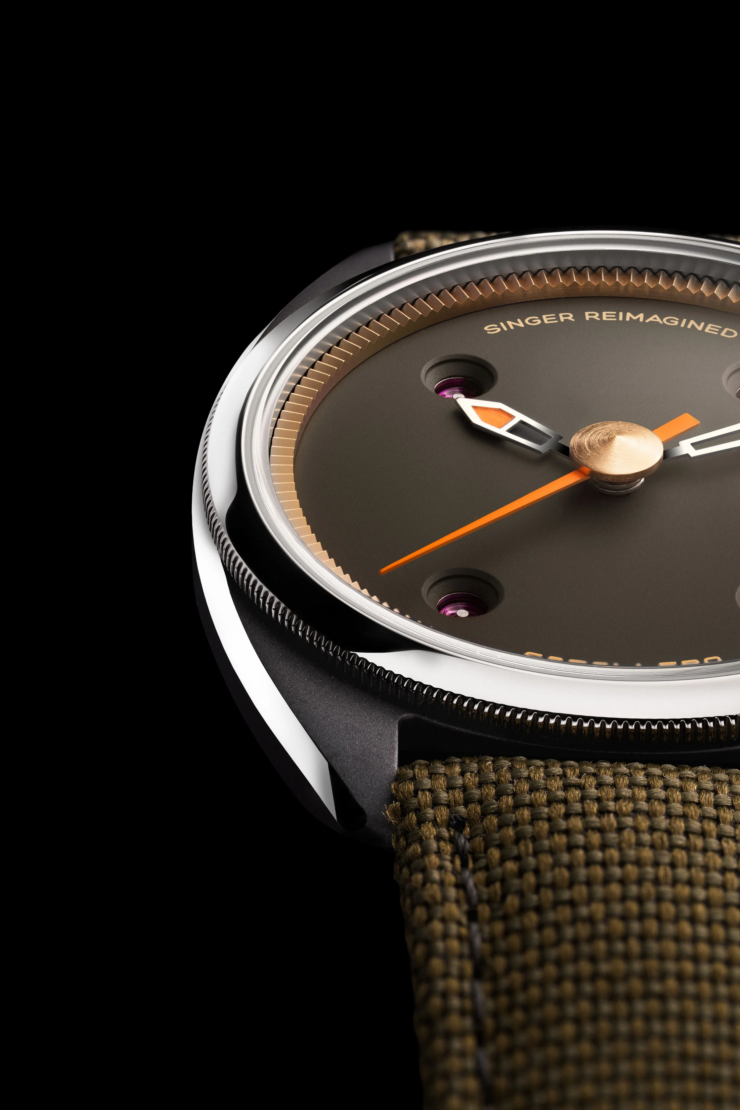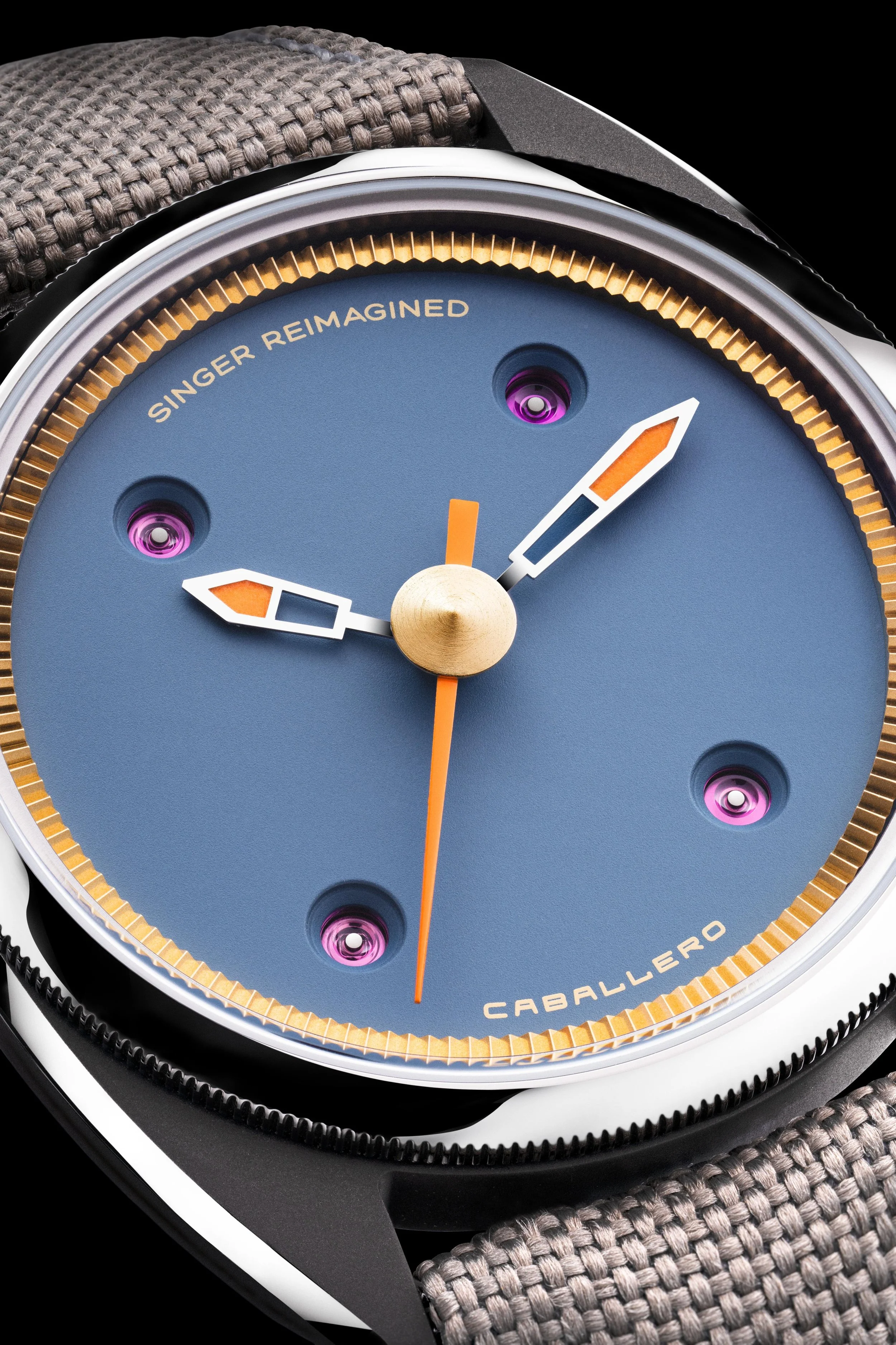 The new colorways—Avio Blue and Cocoa Brown—receive a velvet-touch matte finish that feels both modern and considered. This restraint makes the four visible ruby barrel bearings flash as punctuation rather than decoration. Singer's signature golden toothed flange rings the perimeter, with branding held at the edge. The result is a dial that reads as architecture first, ornament second.