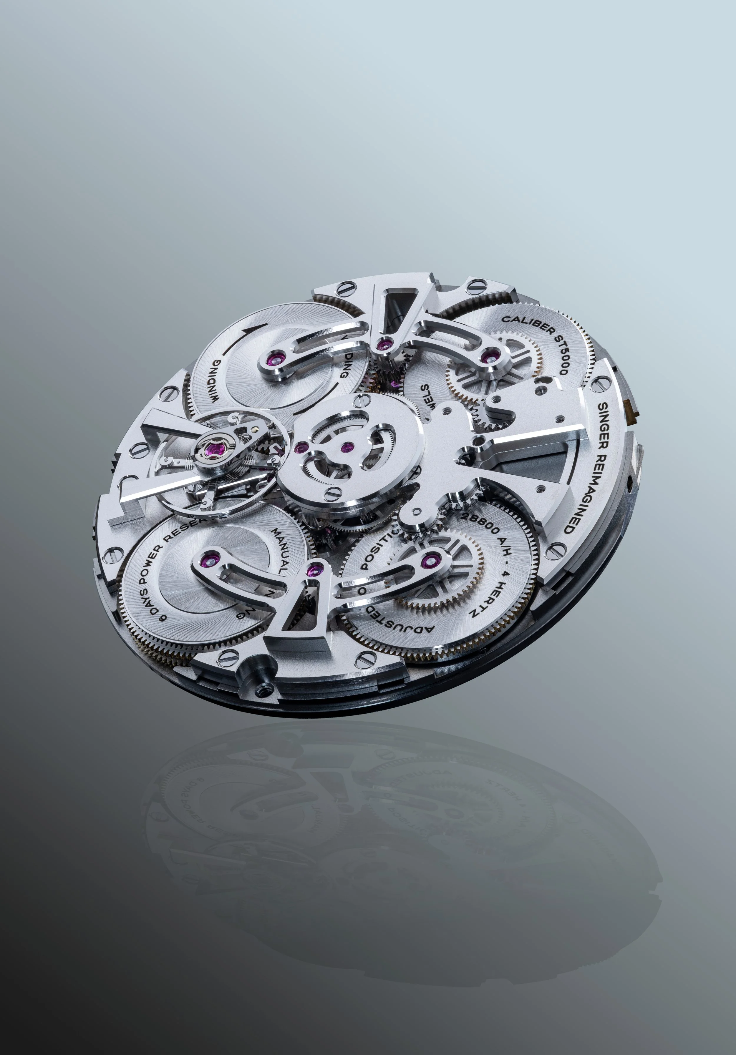 Bridges and plates feature galvanic rhodium-plating with fine microblasting. Chamfers are rhodium-plated cut diamonds. Singer Reimagined engravings appear on all 4 barrels and the winding bridge.