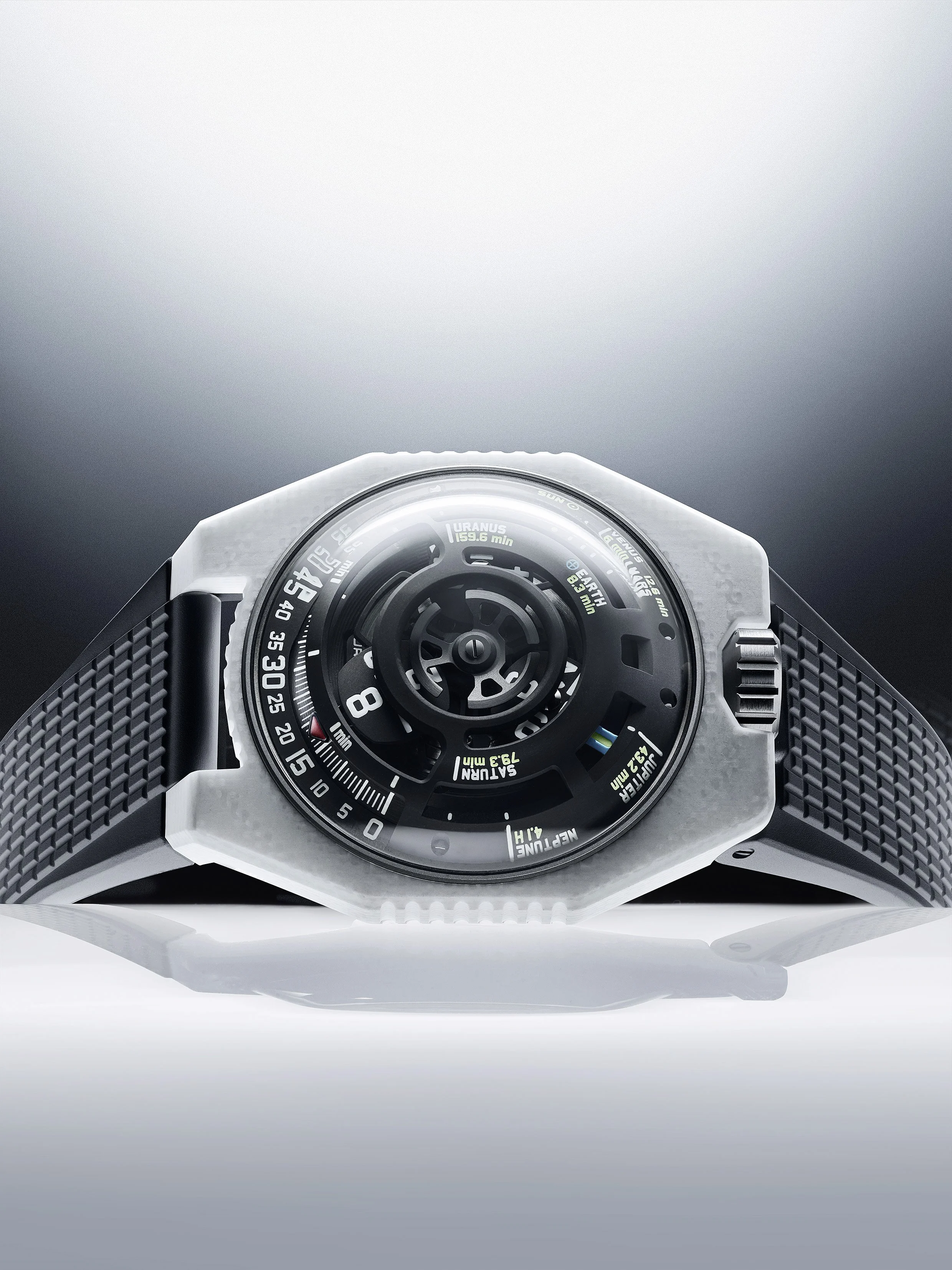 The UR-100V LightSpeed doesn't just tell time—it tracks the journey of photons across our solar system. When the wandering hour satellite completes its 60-minute arc across the dial, it transforms into a cosmic marker, tracing how long sunlight takes to reach each planet.