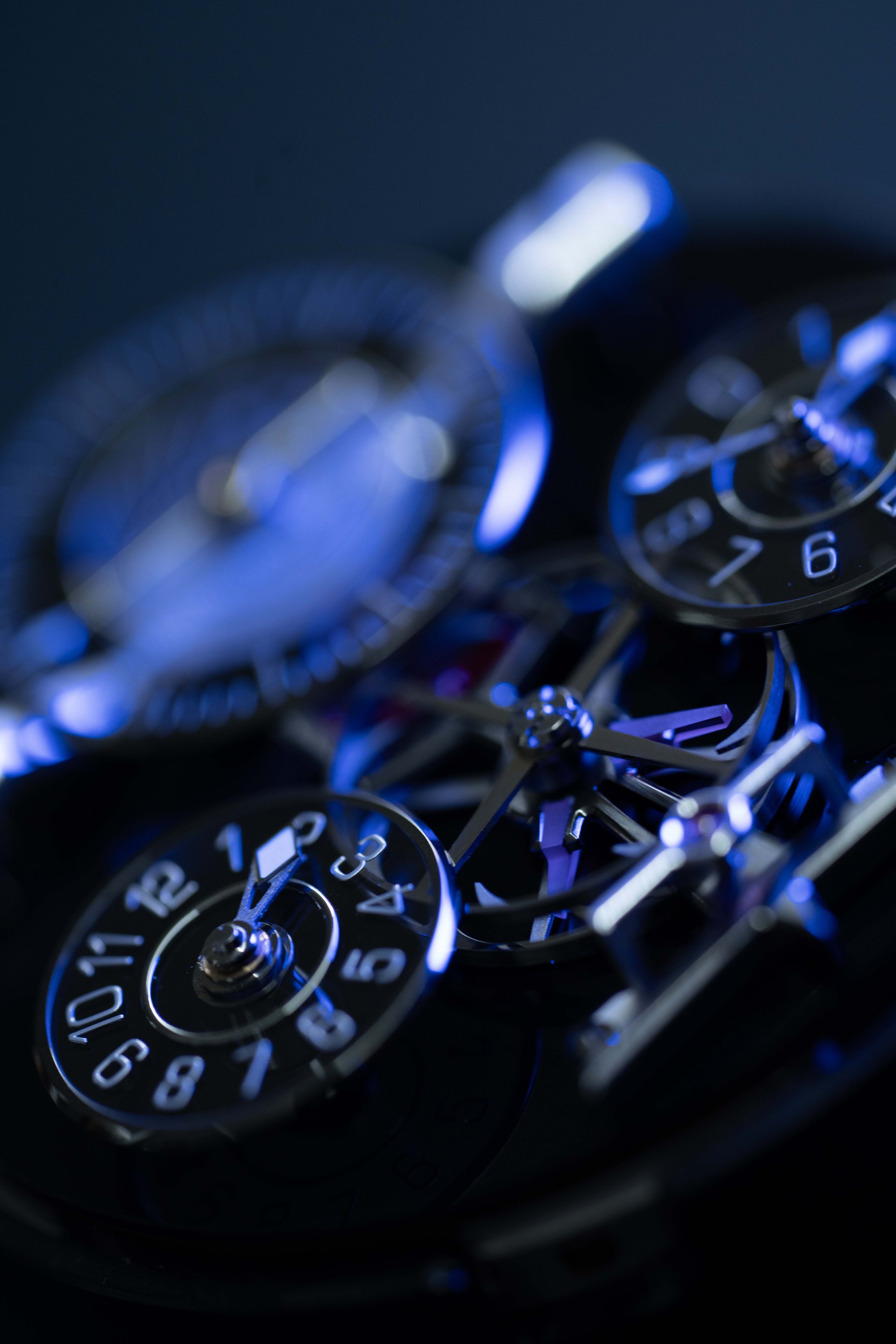 Rather than traditional hands, Bouchet employs jumping indicators that move instantaneously rather than sweeping. The Complication One features: Jumping hours at 8 o'clock Decimal minutes (0-9) with a retrograde tens-of-minutes hand at 4 o'clock An oversized small seconds with integrated day/night indicator at 12 o'clock This five-level division of time—day/night, hours, ten minutes, minutes, and seconds—symbolizes Bouchet's belief that even the largest temporal cycles are composed of tiny, equally important moments.